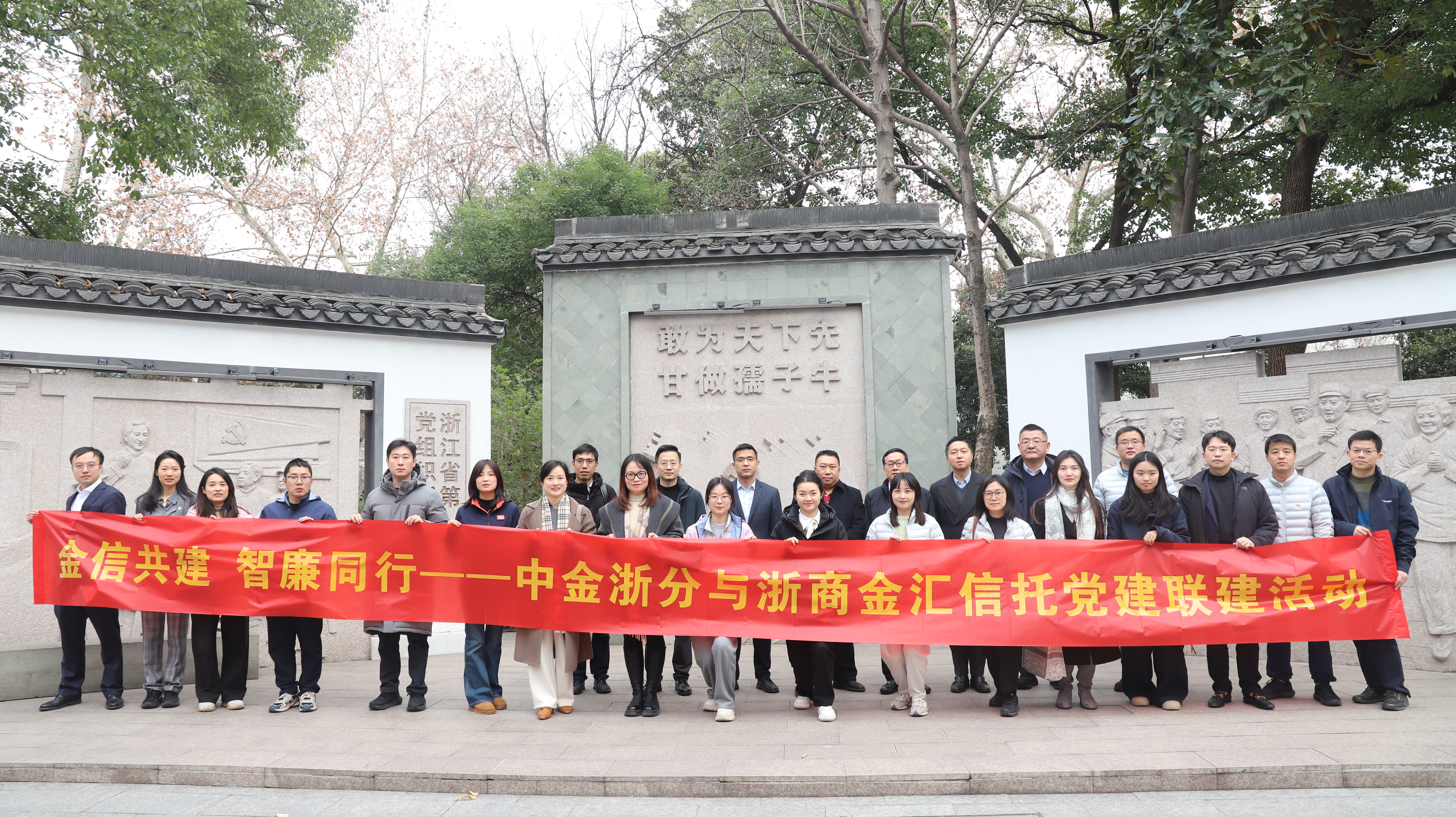 为深入学习贯彻中央关于金融工作的决策部署,推动党建与业务深度融合,1月29日下午,公司党委与中金公司浙江分公司党支部在具有深厚红色底蕴的江南红巷成功举办首次党建联建共建活动。活动以“金信共建 智廉同行”为主题,通过红色教育、专题分享、廉洁共创等形式,促进双方在党建引领下进一步凝聚共识、深化协同、共谋发展。双方党组织领导、党员代表共20余人参加活动。